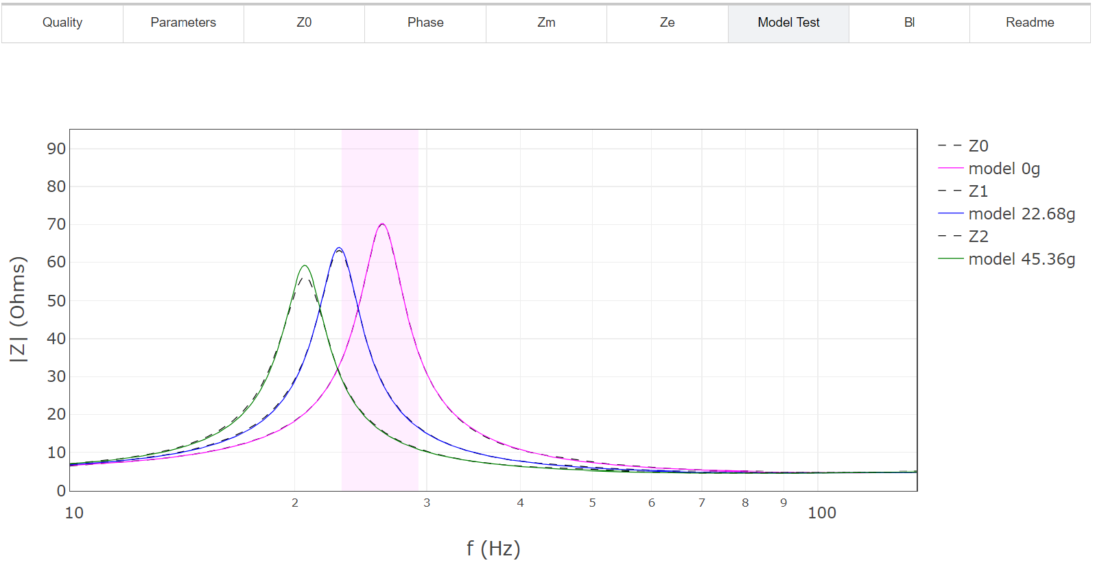 Model test: Speakerbench also generates a key performance test, in which model predictions of impedance are plotted for (1) the computed value of \(M_{MS}\), (2) \(M_{MS} + m_1\), and (3) \(M_{MS} + m_2\). These three model curves are then overlayed with the raw data. If you see three curves neatly on top of three dashed lines, then the fit (solid lines) agree nicely with your measurements (dashed lines), as shown in Fig. 10. We focus on the free-air measurement without added mass, so most likely the first deviations you’ll see are for the measurement with the highest amount of added mass. Here measurement and simulation might deviate by the peak of the impedance, or alternatively one of the slopes.